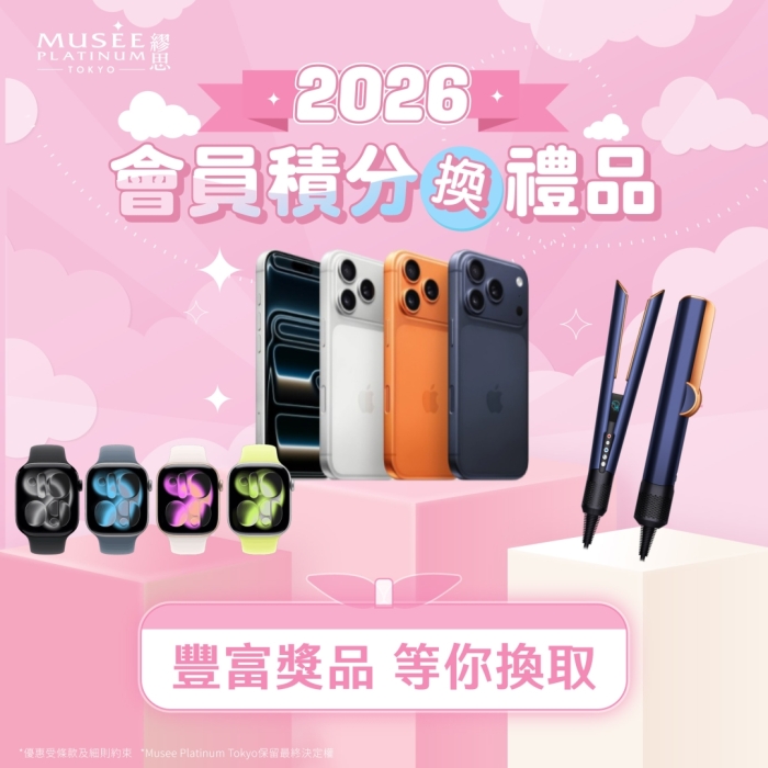 嚟到2026,我哋就為大家準備咗驚喜禮物,用同樣嘅方法賺取更多嘅積分,我哋仲會不定期推出限時嘅積分計劃,立即聯絡我哋預約療程, 賺取積分領取 Musee Platinum Tokyo 為您準備嘅豐富禮品啦!