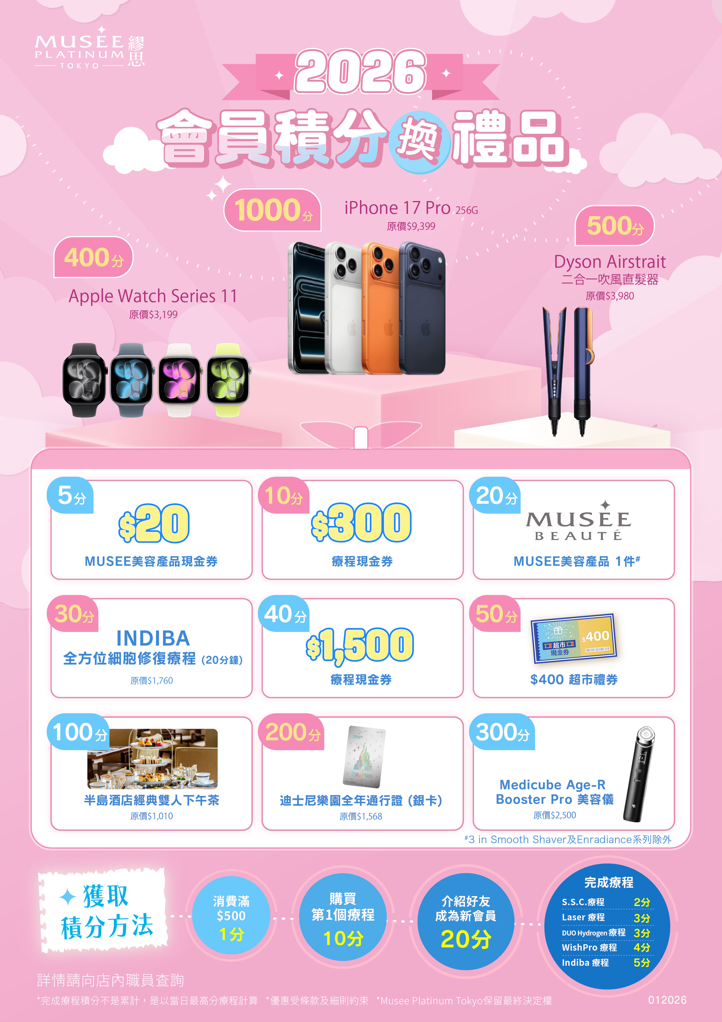 Musee Platinum全新的積分獎賞計劃,讓妳可以從更多方面賺取積分,由購買第一個脫毛療程起,至其後的療程使用,均可獲得不同積分!